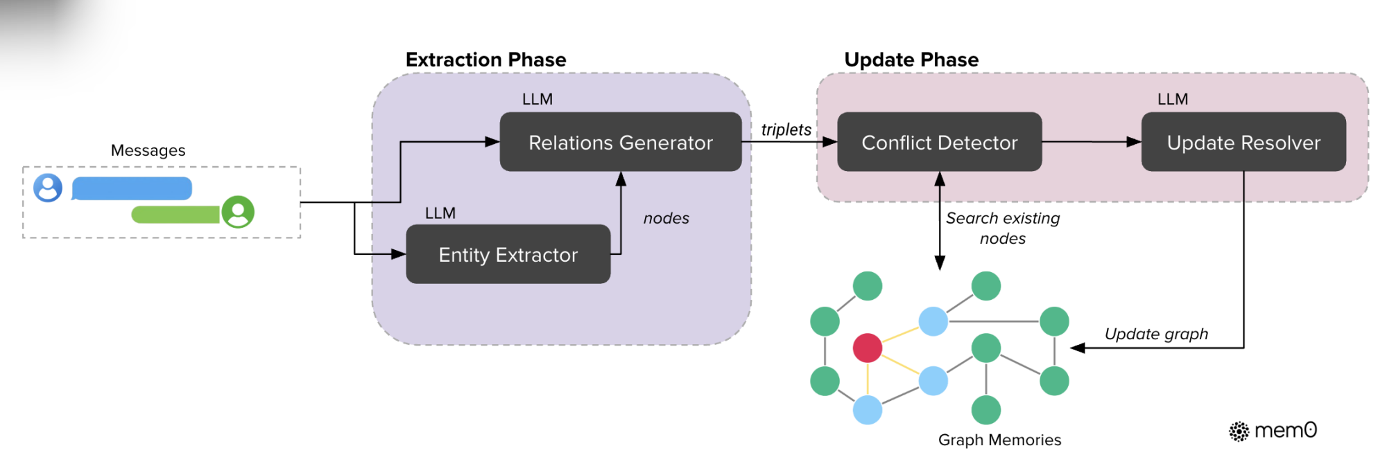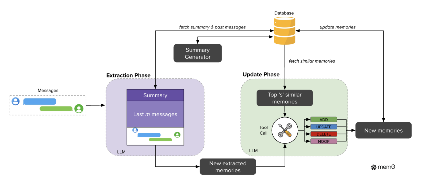 我们拿Mem0举例,它是一个拥趸众多的开源方案,以下是它的流程图片: